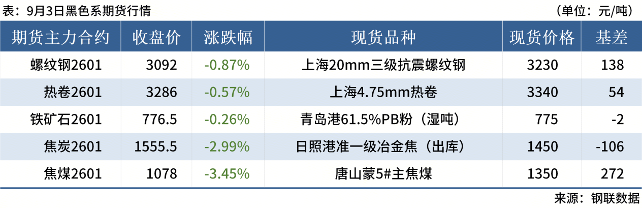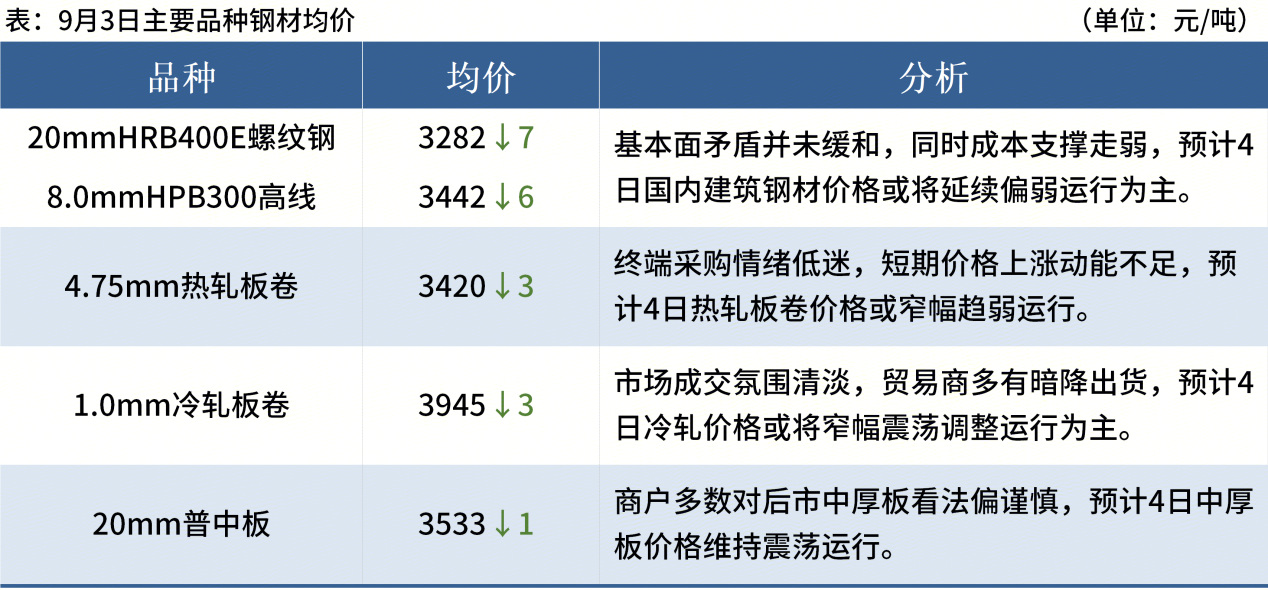 ◎ 9月3日,全國主港鐵礦石成交86.40萬噸,環(huán)比減4%;237家主流貿(mào)易商建筑鋼材成交8.22萬噸,環(huán)比減17%。