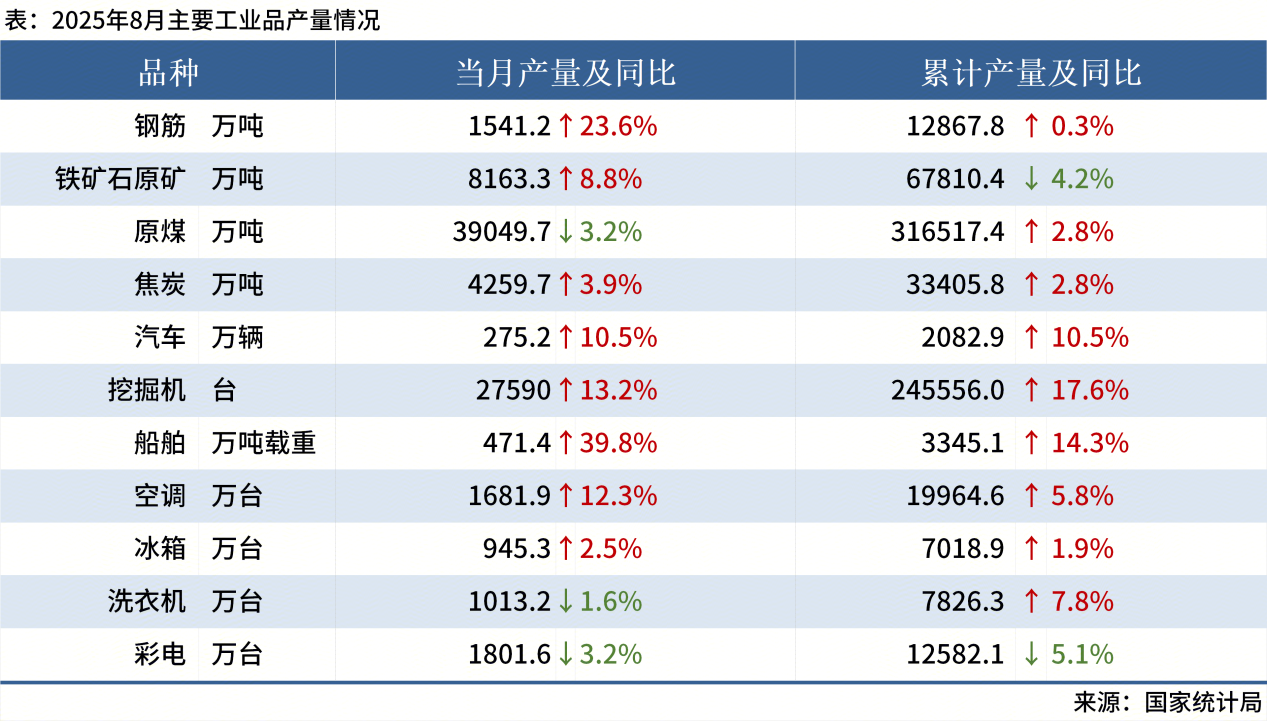 ◎ 國家統(tǒng)計(jì)局:8月中國鋼筋產(chǎn)量為1541.2萬噸,同比增長23.6%;1-8月累計(jì)產(chǎn)量為12867.8萬噸,同比增長0.3%。其他主要工業(yè)品產(chǎn)量如下:
